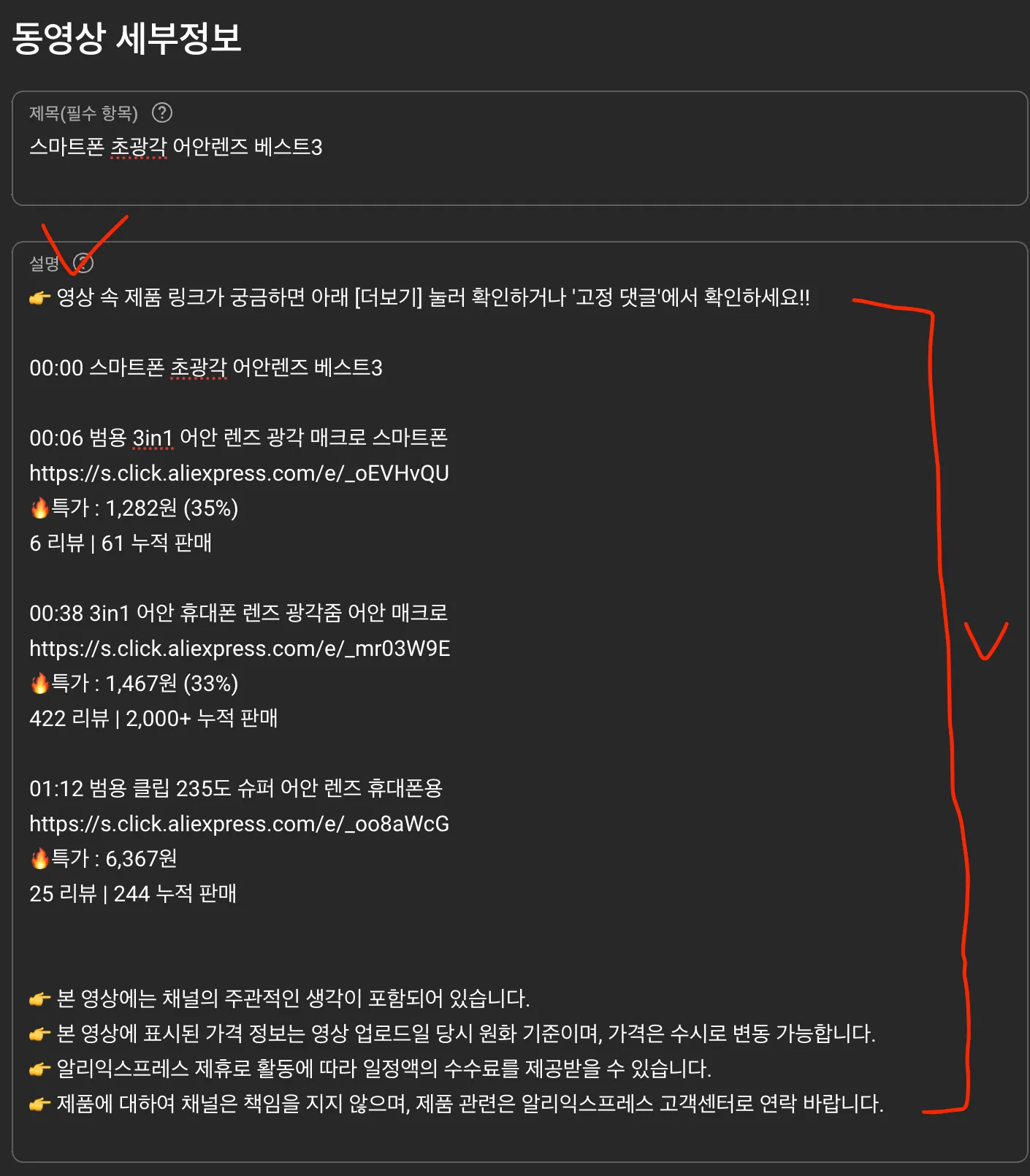 이 때 유튜브 스튜디오에서 동영상 수정으로 들어가 보시면, 업로드시에 동영상의 ‘설명’ 정보(제품명과 함께 쿠팡 파트너스나 알리 어필리에이트 링크가 포함된 정보)도 동영상 세부정보에 아래와 같이 자동으로 입력이 되어 있어서 별도로 입력을 할 필요는 없습니다.