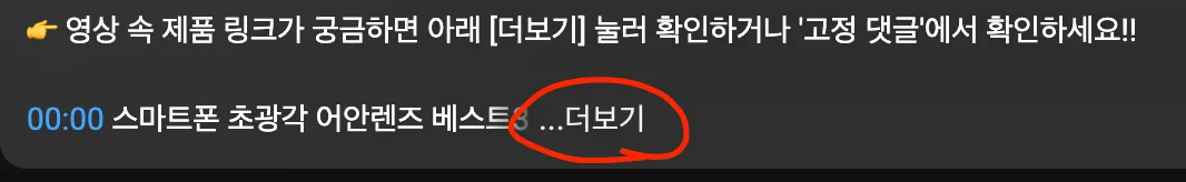 그런데 시청자들 중에는 [더보기] 버튼을 클릭하기보다는 댓글을 살펴보는 경우도 많기 때문에, 댓글에도 위 상품정보를 넣어서 고정해 주시면(고정 댓글) 더 좋습니다.