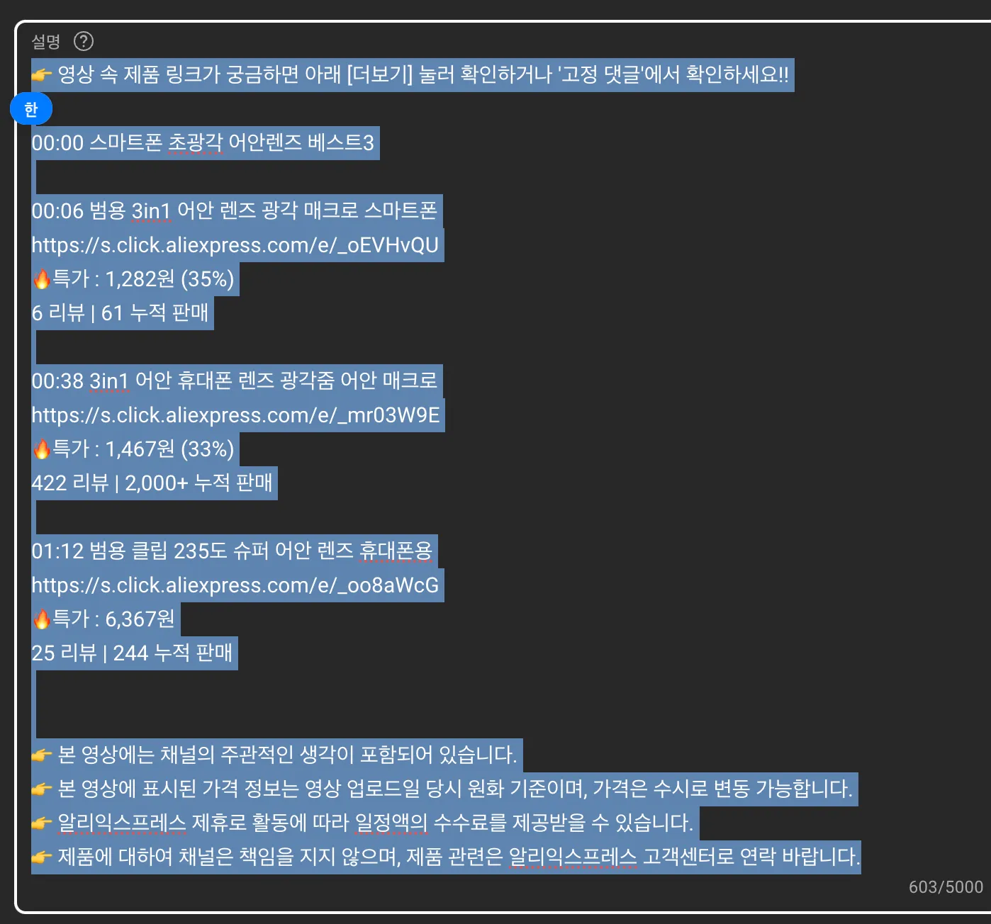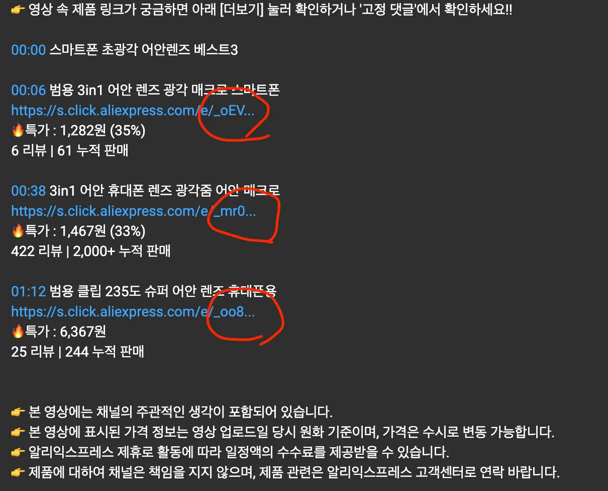 알리 상품의 경우, [더보기]를 눌러 나오는 정보를 복사하시면, 아래에 표시된 것처럼 링크가 다 나오지 않고 잘리게 되어, 고정 댓글로 정보를 달아 놓아도 영상 시청자가 링크를 눌러도 상품으로 갈 수가 없게 됩니다. (쿠팡 파트너스 상품은 링크가 짧기 때문에 단순히 복사하여도 괜찮습니다)