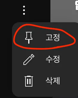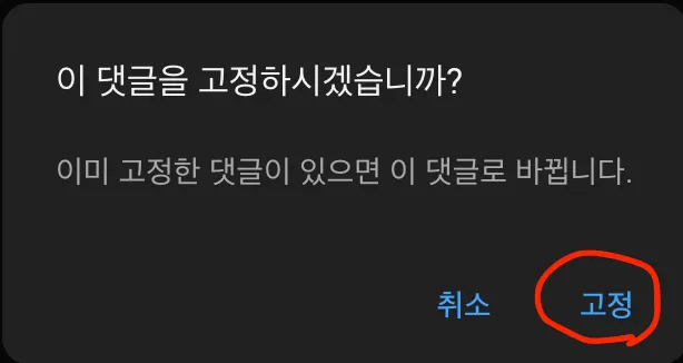 고정댓글은, 댓글은 다신 다음에 우측의 점 세개 버튼을 누르신 다음, 고정을 눌러주시면 댓글이 고정되어 계속 상단에 있게 됩니다.